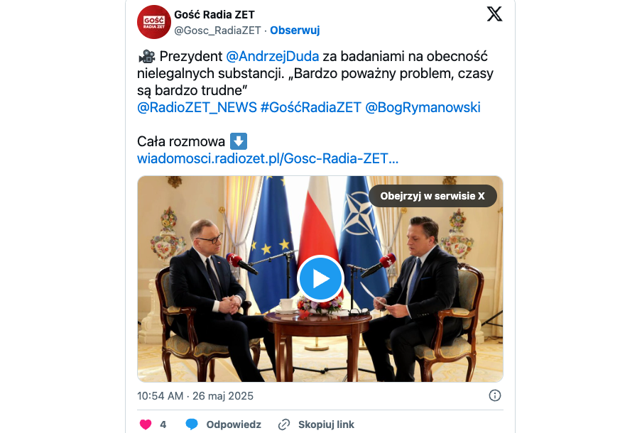 Duda odniósł się również do propozycji badania kandydatów na prezydenta pod kątem substancji psychoaktywnych. Stwierdził, że jest to rozsądny pomysł, a prezydent nie powinien być uzależniony od alkoholu, narkotyków ani innych środków zaburzających myślenie. Podkreślił, że sam nie spożywa alkoholu od lat i prowadzi sportowy tryb życia.