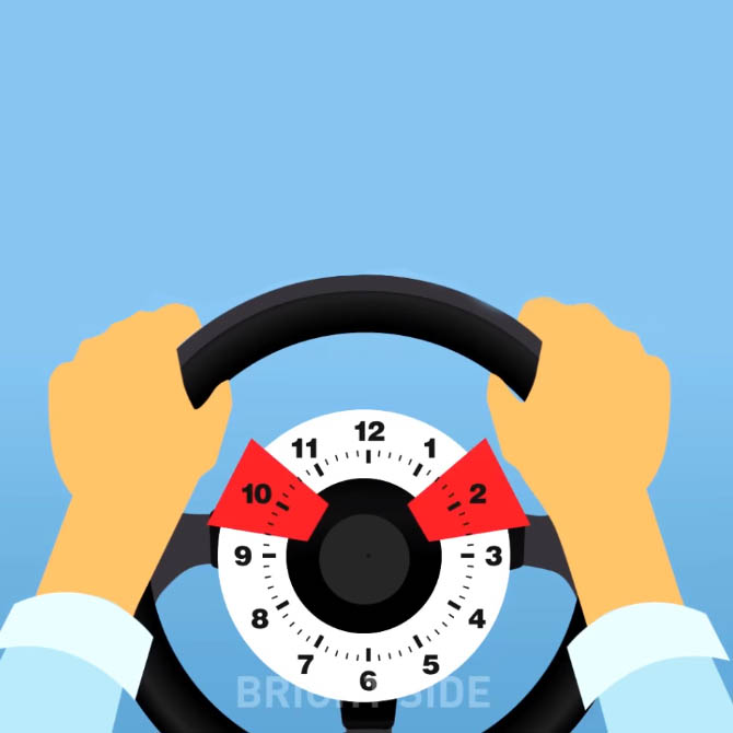 Jeśli nie wiesz jak trzymać ręce na kierownicy, pomyśl o zegarze. Dłonie powinny znajdować się na wysokości godziny 2 i 10. Dzięki takiemu ułożeniu rąk w przypadku poślizgu najlepiej zapanujesz nad samochodem. Jeśli dojdzie do kolizji poduszka powietrzna, znajdująca się w kierownicy, swobodnie się otworzy.