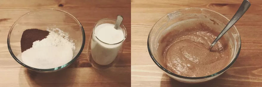 1.W misce wymieszaj sodę z kefirem. W osobnej misce wymieszaj kakao, mąkę oraz cukier, dodaj także przygotowany kefir.