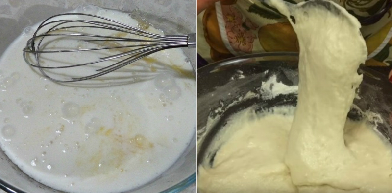 Otrzymane ciasto powinno być gęste oraz puszyste (bardziej gęste niż ciasto naleśnikowe), jednak rękoma nie da się go ugniatać.