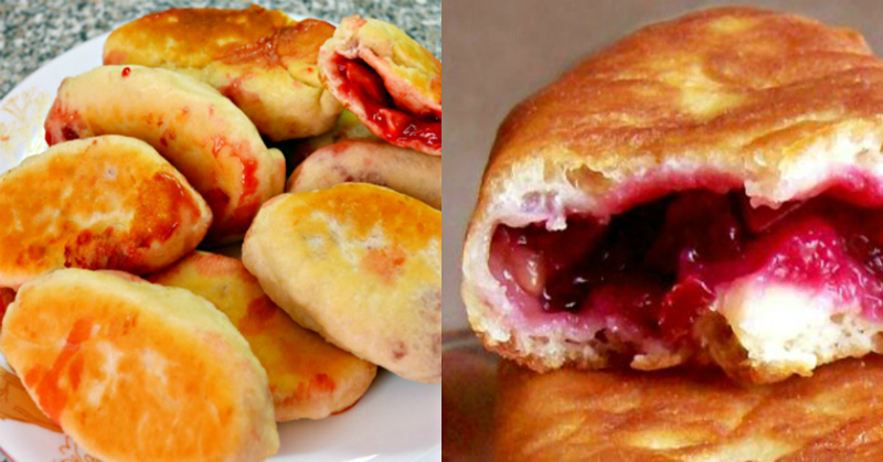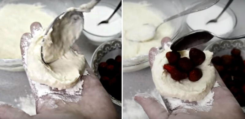 2.Posyp dłoń mąką, następnie za pomocą łyżki stołowej nabierz ciasta i połóż na dłoń . Odrobinę owoców umieść na środku ciasta , następnie zmocz lekko drugą dłoń i połącz ze sobą krawędzie ciasta. Smaż na patelni z dodatkiem oleju słonecznikowego.