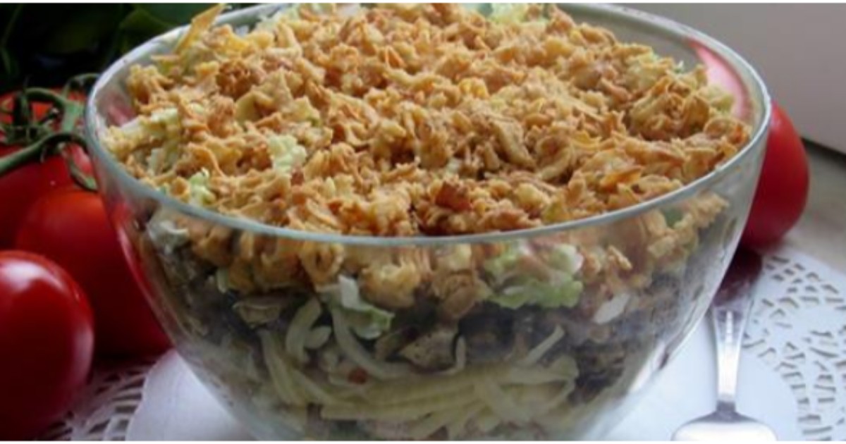 Uwielbiam eksperymentować w kuchni i w wyniku moich kombinacji wyszła taka oto sałatka. Ma ciekawy smak, a w połączeniu  z chrupiącą prażoną cebulką i kurczakiem smakuje rewelacyjnie. Można do niej dać inne dowolne składniki np. zamiast fileta można dać pokrojoną w kostkę szynkę.