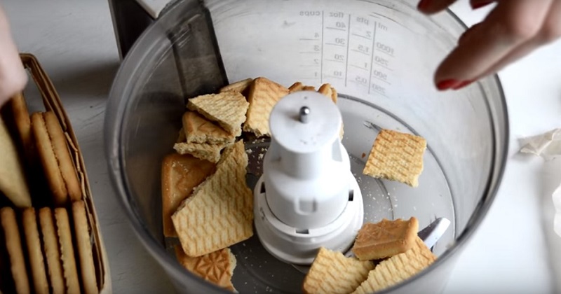 1.Za pomocą blendera lub tłuczka zmiel na miazgę ciastka, tak aby wyglądały jak mąka, następnie wymieszaj to z masłem.
