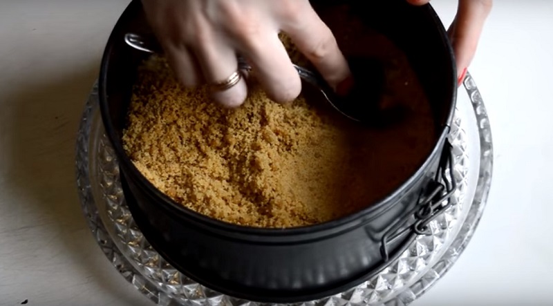 2. Przygotowaną formę wyłóż dokładnie papierem do pieczenia, następnie dokładnie wyrównaj zmielone ciastka, które tworzą spód. Aby stwardniały włóż do lodówki na 30 minut.