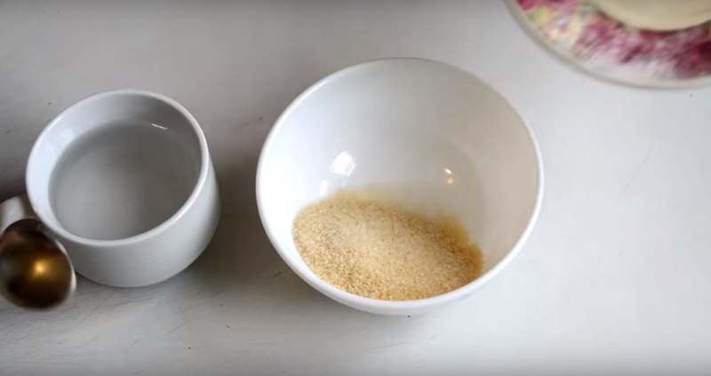 3.Taraz masz czas na zrobienie masy. Do szklanki wlej ¾ wody , następnie wsyp żelatynę i odstaw na około 10 minut. Za pomocą kąpieli wodnej rozpuść żelatynę.