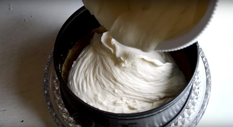 5. Otrzymaną masę wlej do formy, w której są już ciastka. Na około 2-3 godziny odstaw do lodówki, aby ciasto otrzymało właściwą konsystencje.