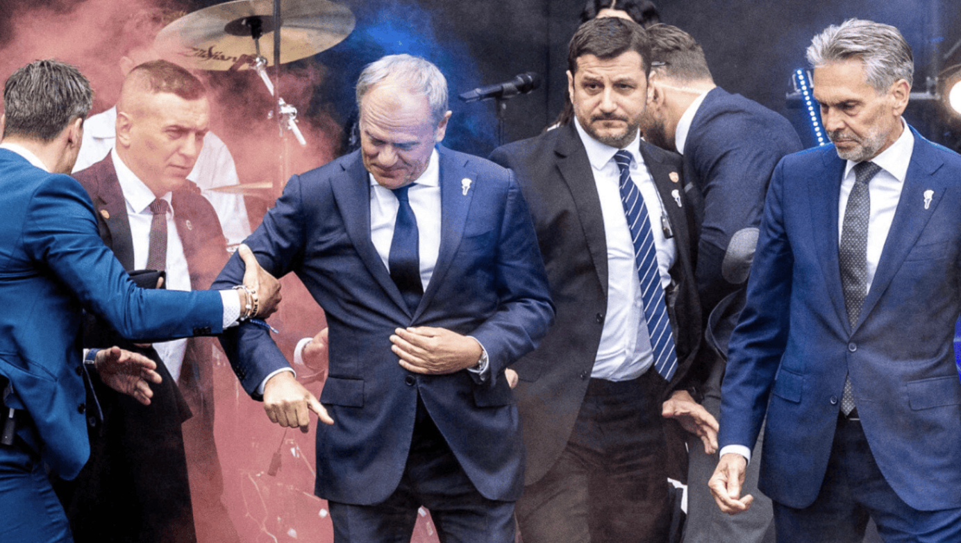 W kulminacyjnym momencie uroczystości doszło do niebezpiecznego incydentu – z tłumu w kierunku premiera rzucono świecę dymną, która upadła tuż przy scenie, zaledwie kilka centymetrów od Donalda Tuska.