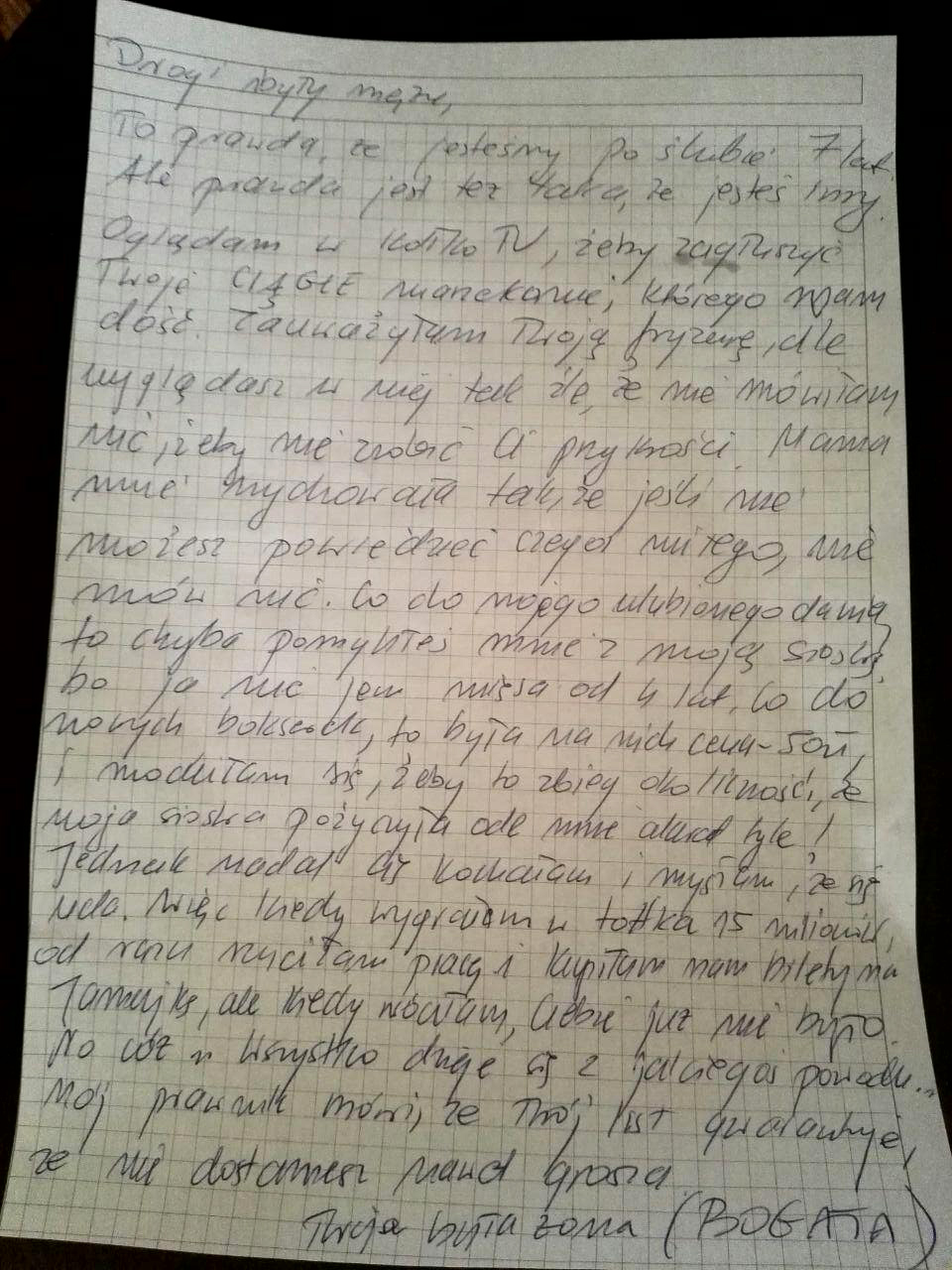 Żona nie pozostała mu dłużna i także wysłała do niego pisemną odpowiedź